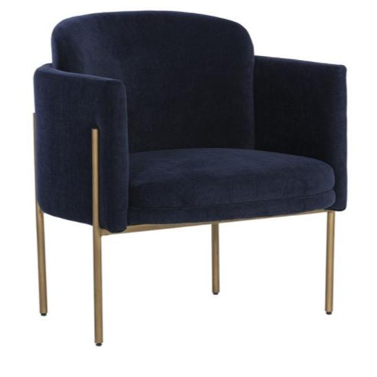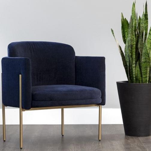 Offrez à vos invités un moment de détente élégant grâce à ce fauteuil moderne de notre collection MIXT. Doté d'une assise confortable en tissu bleu marine Danny à la texture douce et de pieds apparents en fer et laiton antique, il est idéal pour un salon de jardin.