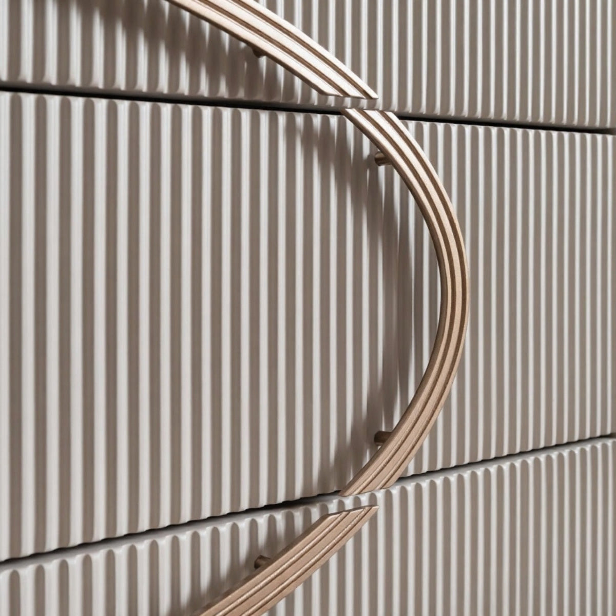 La table de chevet Casto incarne la sophistication moderne, avec sa finition beige chic, ses détails cannelés et ses tons métalliques dorés. Ses deux grands tiroirs offrent un rangement pratique, ce qui en fait un compagnon de chevet élégant et fonctionnel.