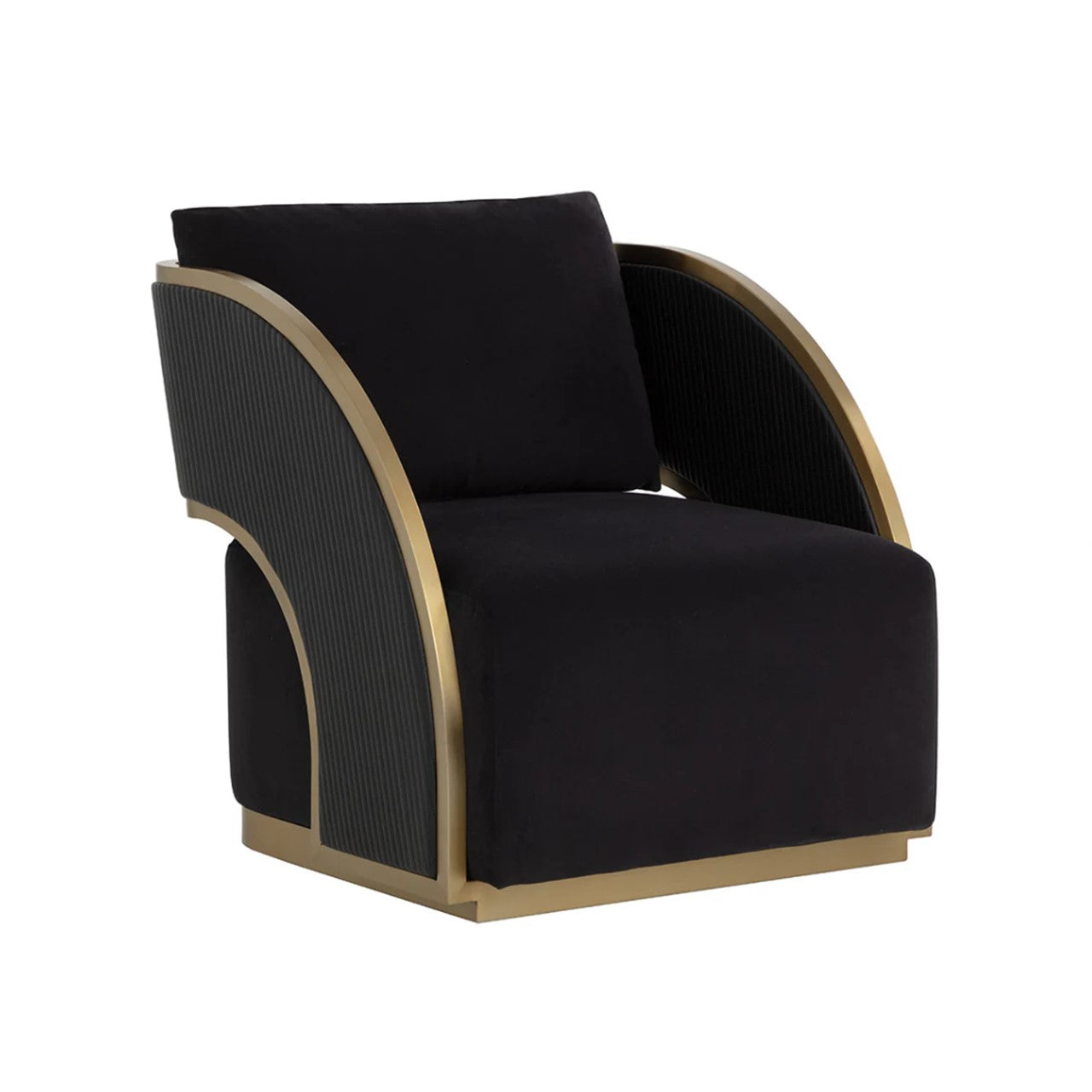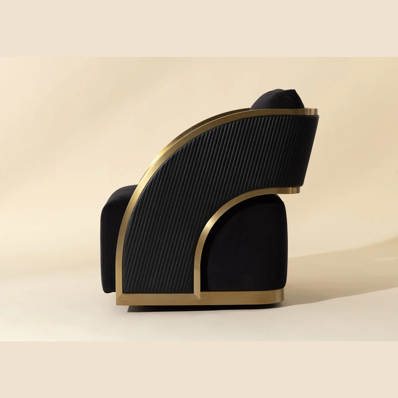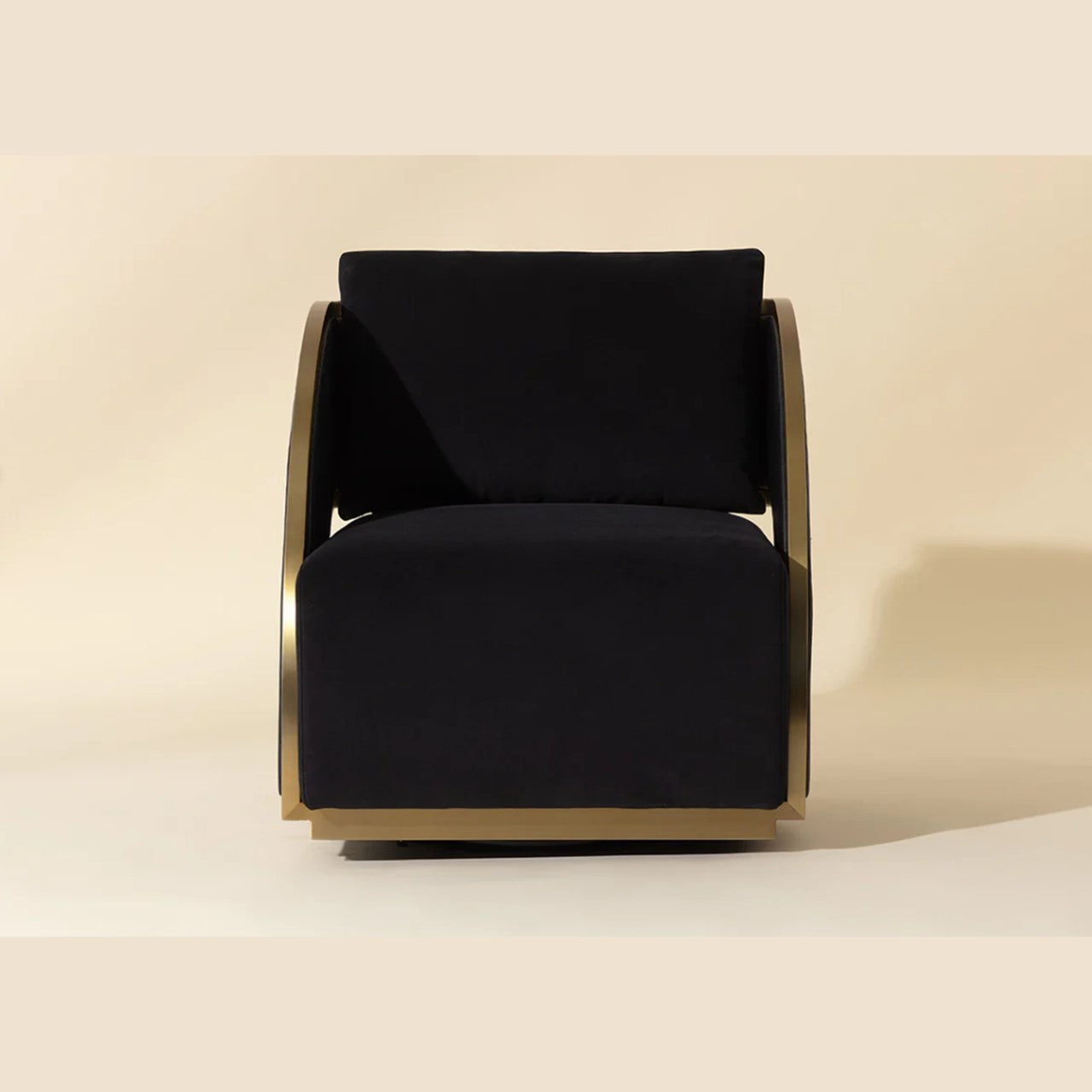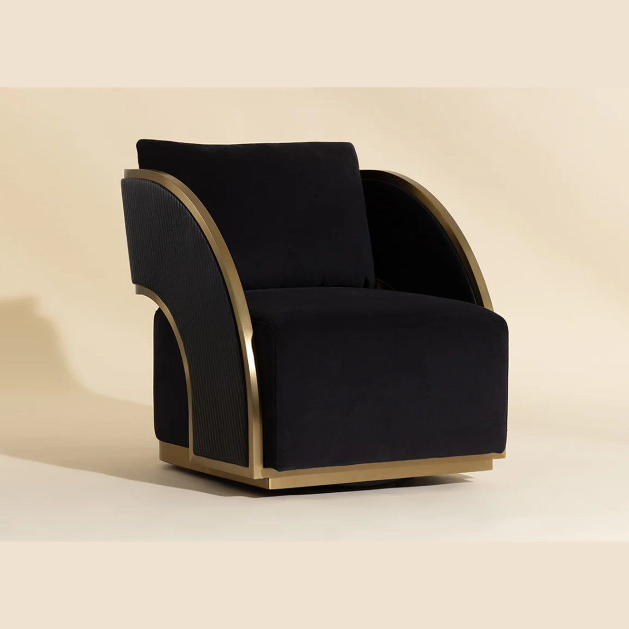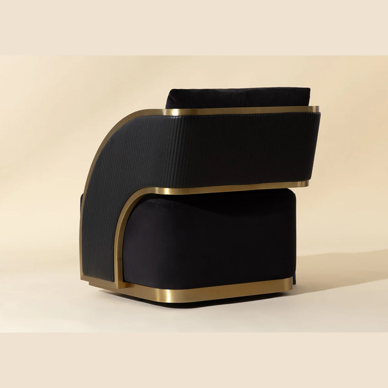Audacieux et élégant, le fauteuil pivotant Baz ne manquera pas de faire tourner les têtes. Sa silhouette audacieuse est revêtue de similicuir noir napa et de tissu noir Abbington. Les détails en acier inoxydable doré et les coutures en canal ajoutent de la profondeur et un impact visuel à l'ensemble.